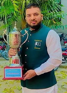 He won two silver medals in 1993 and 2009 at the Commonwealth Wrestling Championships.[3] He also won five bronze medals in 2007, 2009, 2011, at the Commonwealth Wrestling Championship.[4] He made National Champion at the Senior Level in 1991, and after his international debut in 1991 at the senior level. He has also been active in traditional mud wrestling (دیسی کُشتی)where he has won Rustam e Gujranwala division title, Rustam e Punjab title, Rustam Pak o Hind title twice, Hind Kesari.