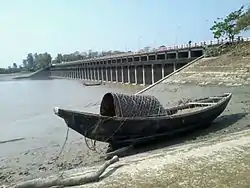 The Muhuri has a total basin area of 839 km2 in Tripura which accounts for 8% of the state's total geographical area. It has an annual flow of 76,247,000 cubic meters of water which amounts to 9.6% of Tripura's total river flows.[8] In Bangladesh, the Muhuri basin covers an area of 40,080 hectares spread across the upazilas of Feni Sadar, Sonagazi, Chhagalnaiya and Parshuram in Feni district and the Mirersarai Upazila of Chittagong district with a total irrigable area of a little over 23,000 hectares.[9] The river is known for its wild nature and flash floods and its frequent changes in course. For the most part, the Muhuri has a width of 150 to 200 meters which increases as it nears the sea. As it nears the sea, it comes under the increasing influence of tidal action. The river is quite shallow and navigable by 4-tonne boats for only half the year and it is possible to ford it during the lean season.[1][10]
