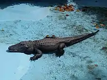 Muja spends the summers in a pond and winters in a special chamber, which was renovated in 2016 to resemble a cave.[6] He is fed once a week and usually eats 5–6 kilograms (11–13 lb) of meat.[3] His diet consists of skinned rats, rabbits, bird, horse meat and beef.[8] He eats this together with bones, which are good for his teeth and calcium levels.[9][10] Due to his old age, it is difficult for him to hunt for his food, and zookeepers instead place it right in front of his jaw.[8] Unless he is being prodded or fed, Muja is usually motionless, leading some visitors to inquire whether he is alive.[6] According to the zoo's veterinarian, Jožef Ezveđ, Muja has a good degree of mobility for an alligator his age.[7]