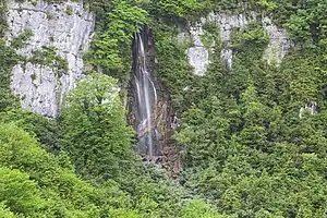 Mukhura Waterfall Natural Monument (Georgian: მუხურას ჩანჩქერის ბუნების ძეგლი) is a waterfall with a height of 60-70 m at 882 m above sea level in Tkibuli Municipality, Imereti region of Georgia.[2] [1] Water flows from the cave located on the slope of eastern exposure and forms a three step waterfall. Inside the cave there is one small and one big lake. There also flows of a pristine river inside the cave, which locals refer to as Tskalmechkheri (shallow water). The banks of the waterfall are covered in mixed broadleaf forest. The place is home to many endemic species, such as Caucasian mole, Volnukhin and Caucasian water shrew. Ten different kinds of bats live in the cave.