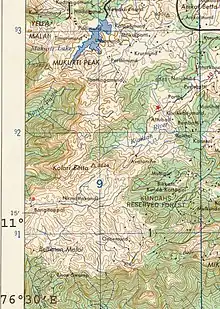 Pichalbetta (height: 2,544 metres (8,346 ft)), Nilgiri Peak and Mukurthi Peak are the important heights of this area. Though not the highest hills in the Nilgiris, these three hills stand out in relation to the generally uniform level of this area.[12]