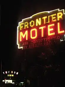 In the following years, the highway's popularity increased dramatically. During the 1950s, more motorists traveled on US 80 between Arizona and California than on the famous US 66.[3] Approximately 2,500 cars travelled on US 80 each day by the middle of the decade. Arizona's five largest cities of the time were also located along the highway.[12] Like its northern counterpart, US 80 also featured many iconic road side businesses and attractions, which included Boothill Cemetery and the O.K. Corral in Tombstone, Stoval's Space Age Lodge in Gila Bend, Yuma Territorial Prison, the Geronimo Surrender Monument near Douglas and the Painted Rock Petroglyph Site. Rows of iconic neon signed motels aligned US 80 in the many towns and cities it passed through, including Tucson's Miracle Mile. High demand for motel rooms by U.S. Army personnel and the postwar population boom in Tucson resulted in an explosive growth of hotel and restaurant construction on Miracle Mile and Benson Highway southeast of downtown.[9] As of 2016, many of these attractions and structures have been listed on the National Register of Historic Places.[13] Further adding to the increased success, the January 1956 issue of Arizona Highways magazine was partially dedicated to the state's section of US 80.[12]