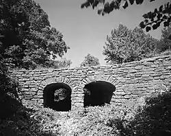 The Mulladay Hollow Bridge is a stone arch bridge in rural Carroll County, Arkansas. It carries County Road 204 across Mulladay Hollow Creek, near the southwestern tip of Lake Leatherwood It has two spans, and is built out of roughly square and semi-coursed fieldstone. The arches are elliptical in shape, 9 feet (2.7 m) in height and 9.5 feet (2.9 m) wide, with nearly-square voussoirs forming the arches. The barrels of the arches are skewed with respect to the spandrels, and the wing walls are slightly curved. The roadway carried by the bridge is 30 feet (9.1 m) wide, and the total length of the structure is 120 feet (37 m). The bridge was built with Works Progress Administration funding as part of the development of Lake Leatherwood as a recreation area.[2]