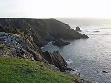 The parish comprises 5,007 acres (20 km2) of land, 8 acres (3.2 ha) of water and 55 acres (22 ha) of foreshore.[2] It is on the Lizard Peninsula, which lies within the Cornwall Area of Outstanding Natural Beauty (AONB). Mullion contains three designated Sites of Special Scientific Interest (SSSIs) – West Lizard SSSI, Baulk Head to Mullion SSSI and Mullion Cliff to Predannack Cliff SSSI, which includes Mullion Island. Mullion Cliff to Predannack Cliff SSSI is noted for its geological and biological interest and contains ten Red Data Book of rare and endangered plant species.[26] Much of the Lizard National Nature Reserve (NNR) is within the parish boundary. The South West Coast Path, which follows the coast of south-west England from Somerset to Dorset passes by on the cliffs along the western edge of the parish.[1]