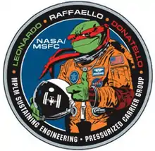 Since the module names are also the names of three of the four Teenage Mutant Ninja Turtles, the NASA MPLM Group approached Mirage Studios artist A.C. Farley to design a logo featuring Raphael in an astronaut flight suit.[4] There were cloisonné pins produced, as well as stickers and embroidered patches. Because the Ninja Turtles were created by Mirage Studios and owned by them at the time (the rights are now owned by Paramount Global, formerly ViacomCBS), NASA gave Mirage the copyright to the logo in exchange for the use of the studio's character on it.[4]