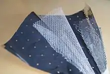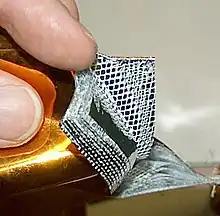 The layers of MLI can be arbitrarily close to each other, as long as they are not in thermal contact. The separation space only needs to be minute, which is the function of the extremely thin scrim or polyester 'bridal veil' as shown in the photo. To reduce weight and blanket thickness, the internal layers are made very thin, but they must be opaque to thermal radiation. Since they don't need much structural strength, these internal layers are usually made of very thin plastic, about 6 μm (1/4 mil) thick, such as Mylar or Kapton, coated on one or both sides with a thin layer of metal, typically silver or aluminium.[4] For compactness, the layers are spaced as close to each other as possible, though without touching, since there should be little or no thermal conduction between the layers. A typical insulation blanket has 40 or more layers.[4] The layers may be embossed or crinkled, so they only touch at a few points, or held apart by a thin cloth mesh, or scrim, which can be seen in the picture above. The outer layers must be stronger, and are often thicker and stronger plastic, reinforced with a stronger scrim material such as fiberglass.