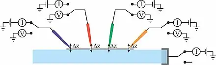 Performing electrical measurements with a multi-tip STM demands more than four tips and the ability to position them as required. Concerted measurements of currents and voltages with all four tips must be performed. The electronics allows operating each tip either as (biased) current probe, or as voltage probe. Different I-V ramps are applied between different tips (and/or the sample). In the simplest case a current is injected between the two outer tips and a potential difference is measured between the inner tips (classical four-point measurement), also as a function of temperature. [4] However, also various kinds of other measurements can be performed, e.g., a tip or the sample can be used as gate electrode.