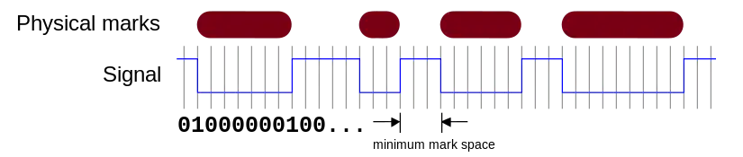 To store information onto a physical surface, the data must be transformed into a series of marks, using a modulation code. The codes used in most optical disc systems are binary, meaning that resulting surface has only two states: marks and non-marks. The following figure illustrates the EFM code used in CDs and DVDs: