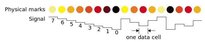 MultiLevel recording refers to the use of multiple reflectivity values to encode data onto an optical disc. By using more than two levels, more information can be put into the minimum feature size. The following figure illustrates a MultiLevel code (note: colors are used only to represent differences in intensity):