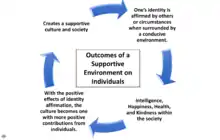 Past research has been conducted by middle-class North Americans analyzing culturally different societies by means of comparison mostly involving middle-class North Americans and/or aforementioned W.E.I.R.D. societies. What has been characterized as Euro-American centrism, resulted in a great volume of research for this specific selection of humans. It has also allowed us to divert from the idea that certain psychological processes can be considered basic or universal, and recognize humans' remarkable capacity to create cultures and then be shaped by them.[26] Although cultural psychology has internalized the mutually constituting model, further implementation in our society is necessary. Being aware of this model promotes taking responsibility for one's actions and the effect that their actions have on their community. Through acceptance of ones responsibilities and conscious application, communities have opportunity for improvement which in turn supports the individuals within the community. These ideas can be found in the journal article "Cultures and Selves: A Cycle of Mutual Constitution" by Hazel Rose Markus and Shinobu Kitayama which are also represented in the graphic provided.