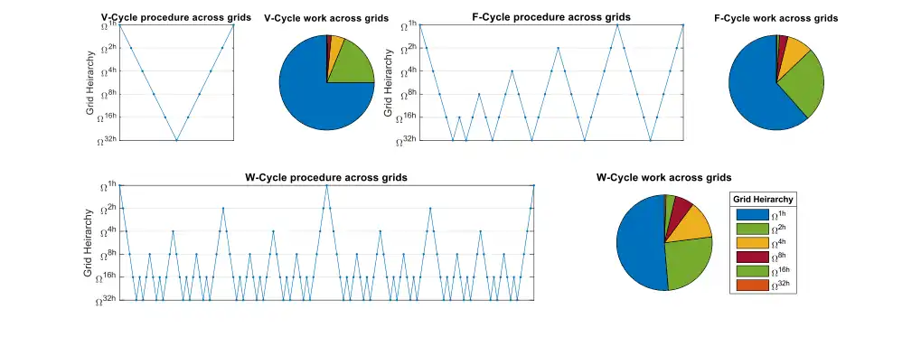 There are many choices of multigrid methods with varying trade-offs between speed of solving a single iteration and the rate of convergence with said iteration. The 3 main types are V-Cycle, F-Cycle, and W-Cycle. For a discrete 2D problem, F-Cycle takes 83% more time to compute than a V-Cycle iteration while a W-Cycle iteration takes 125% more. If the problem is set up in a 3D domain, then a F-Cycle iteration and a W-Cycle iteration take about 64% and 75% more time respectively than a V-Cycle iteration ignoring overheads. Typically, W-Cycle produces similar convergence to F-Cycle. However, in cases of convection-diffusion problems with high Péclet numbers, W-Cycle can show superiority in its rate of convergence per iteration over F-Cycle. The choice of smoothing operators are extremely diverse as they include Krylov subspace methods and can be preconditioned.