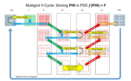 In numerical analysis, a multigrid method (MG method) is an algorithm for solving differential equations using a hierarchy of discretizations. They are an example of a class of techniques called multiresolution methods, very useful in problems exhibiting multiple scales of behavior. For example, many basic relaxation methods exhibit different rates of convergence for short- and long-wavelength components, suggesting these different scales be treated differently, as in a Fourier analysis approach to multigrid.[1] MG methods can be used as solvers as well as preconditioners.