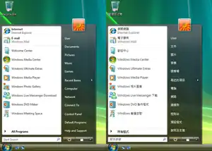 Comparison of Windows Vista Ultimate Start Menu with English selected in the left image, and Traditional Chinese selected in the right.