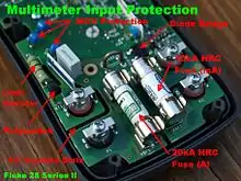 Good quality multimeters designed to meet Category II and above standards include high rupture capacity (HRC) ceramic fuses typically rated at more than 20 A capacity; these are much less likely to fail explosively than more common glass fuses. They will also include high energy overvoltage MOV (Metal Oxide Varistor) protection, and circuit over-current protection in the form of a Polyswitch.
