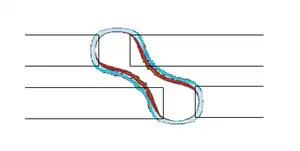 A two-beam interference pattern (half-pitch <0.5 λ/NA) forms a set of regularly spaced lines. Breaks in such lines, e.g., brick patterns, are deviations from the interference pattern. Such breaks generally do not dominate the pattern, and are thus small deviations. These deviations are insufficient to completely offset the constructive or destructive interference of the underlying regular line pattern; sidelobes often result.[38][39] Line end gaps are easily bridged under dipole illumination.[40] Another mask exposure (usually referred as a cut mask) is therefore necessary to break the line pattern more robustly.