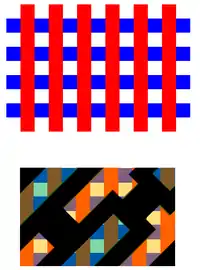 The earliest implementation of multiple patterning involved line cutting. This first occurred for Intel's 45nm node, for 160 nm gate pitch.[41] The use of a second mask to cut lines defined by a first mask does not help increase feature density directly. Instead it allows definition of features, e.g., brick patterns, which are based on lines spaced at a minimum pitch, in particular, when the lines are near the resolution limit and are generated by the two-beam interference mentioned above. The two-beam interference still dominates the diffraction pattern.[38] In fact, in the absence of a separate cut exposure, the gap between the ends of the minimum pitch lines will be prohibitively large.[42][43] This is due to rounding resulting from reduced spatial frequencies.[44]