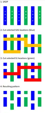 SADP with self-aligned blocking/cutting. Self-aligned blocking or cutting allows lines to be divided into two colors, due to the use of two different materials of different etch selectivity. Only lines of one color may be cut by a given mask exposure.