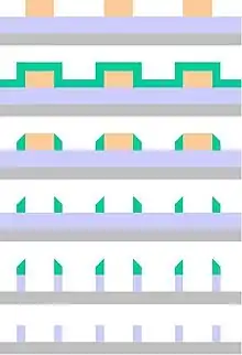The main issues with the spacer approach are whether the spacers can stay in place after the material to which they are attached is removed, whether the spacer profile is acceptable, and whether the underlying material is attacked by the etch removing the material attached to the spacer. Pattern transfer is complicated by the situation where removal of the material adjacent to the spacers also removes a little of the underlying material. This results in higher topography on one side of the spacer than the other.[50] Any misalignment of masks or excursion in pre-patterned feature critical dimension (CD) will cause the pitch between features to alternate, a phenomenon known as pitch walking.[51]
