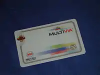 Multivía is a contactless card designed for paying the travel fares in the mass transport system Transantiago, in Santiago, the capital of Chile. Tarjeta Bip! or Bip! Card is a plastic card equipped with a chip, that automatically discounts the cost of a travel when passing the card near a contactless card reader.