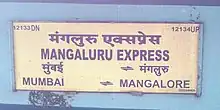 ![]() Nameboard of Mumbai CSMT–Mangalore Jn. SF Express | |