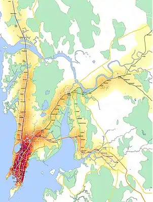 The Mumbai Suburban Railway (Marathi: मुंबई उपनगरीय रेल्वे) (colloquially called local trains or simply locals)[2] consists of exclusive inner suburban railway lines augmented by commuter rail on main lines serving outlying suburbs to serve the Mumbai Metropolitan Region. Spread over 390 kilometres (240 mi),[3] the suburban railway operates 2,342 train services and carries more than 7.5 million commuters daily.