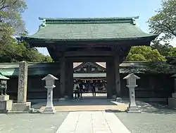 All three shrines are located in Fukuoka Prefecture, yet they are all on separate islands. The main shrine, Hetsu-gū, is located on the mainland of Kyūshū. Nakatsu-gū is established at the foot of Mt. Mitake on the island of Ōshima off the west coast of Kyūshū.[3] The final shrine, Okitsu-gū, is on the island of Okinoshima located in the middle of the Genkai Sea. The shrine occupies the entire island, therefore women are not allowed to set foot on the island and men must perform a purification ceremony before landing.[4]