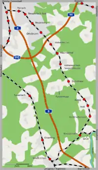 The branch line, which originally ran only from Munich-Giesing to Aying, was one of the last radial railway lines built between Munich and its surroundings.[2] The municipalities of Peiß, Helfendorf, Egmating, Siegertsbrunn, Hohenbrunn, Höhenkirchen, Brunnthal and Oberpframmern sought the construction of a railway from 1892. For the present, however, the Munich East–Deisenhofen line was given preference. According to the first plans, south of Aying/Peiß the line would run have run through Helfendorf to Grub, where it would have connected to the Mangfall Valley Railway. Also being considered was a route running west to Otterfing on the line from Deisenhofen to Holzkirchen or running directly to Holzkirchen. There was also disagreement over the location of the station in Dürrnhaar (the westernmost village of Faistenhaar wanted to see the route run further west) and the railhead in Aying. The latter was originally built further south between Aying and Peiß (near the current level crossing). The construction of the railway was approved on 2 March 1900. Construction started on the line on 1 April 1902. A train with several celebrities (including the Minister of Transport) made a trial run on the line on 28 May 1904 and it was opened shortly thereafter on 5 June. The extension of the line to Kreuzstraße went into operation in 1912. The line was electrified in 1971/72. On 28 May 1972, the opening day of the Munich S-Bahn, the section of line S 1 (then running Freising–Munich–Kreuzstraße) was opened to Hohenbrunn with train and bus services continuing towards Aying and Kreuzstraße.[3][4] On 30 September 1973, these temporary services were abandoned and the S-Bahn was extended from Hohenbrunn to Kreuzstraße.[5]