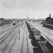 The Munich Centralbahnhof precinct was divided into three station sections. The first section, which was also called the inner section, took over passenger, express freight, and small freight operations. The middle section at Arbeitersteg (“workers’ bridge”, now called Donnersberger Bridge) contained wagonload operations and the marshalling yard. The outer section ended at the Friedenheimer Bridge and included locomotive and carriage sheds and the central workshop.[27] The station was 2.9 km (1.8 mi) long up to its last crossover and 580 metres (1,900 ft) wide at its widest point. There were 226 sets of points, 42 turntables and 82.3 km (51.1 mi) of tracks.[15]