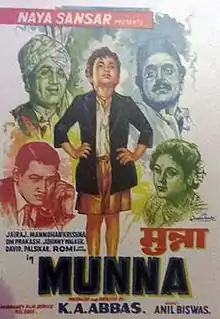 Munna also called The Lost Child is a 1954 Hindi social drama film produced and directed by K. A. Abbas for the Naya Sansar banner.[1] The story was written by Abbas with photography by Ramchandra.[2] The music director was Anil Biswas though there were no songs in the film.[3] Master Romi played Munna and the actor Jagdeep appeared as a child artist in the film. The rest of the cast included Sulochana Chatterjee, Shammi, Tripti Mitra, Achala Sachdev, David, Manmohan Krishna, Johnny Walker, Rashid Khan and Nana Palsikar.[4]