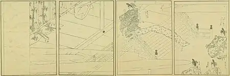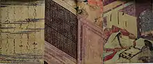 The painting technique of tsukuri-e ("built painting"), used mainly in emaki of the court in the 12th century, is also used here.[2] It is done in three stages: a first sketch of the scene is made with Indian ink (probably by a master of the workshop), then the color is applied on the entire surface of the paper in a specific order, from large areas in the background to fine details. Finally, the contours are enhanced or revived in ink to emphasize the depth.[21] However, a visible change in style may again be noted, because the pigments are here less opaque than usual, and the more subtle shades are highlighted by fine outlines in ink; and in addition, the decorative aspect emerges strongly through extensive use of gold dust, and sometimes of silver.[2] According to Mason, the technique seems to be less careful than in the past, as can be seen in elements of the architectural interior (such as sliding doors and screens) which lack detail or in the silver powder which is used much less often in general compared to gold.[4]