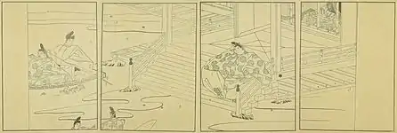 Two elements are found in the illustrations of the emaki: people indoors engaging in activities typical of the aristocracy of the period, such as writing letters, playing instruments, exchanging poems or talking to each other; and the gardens outside their buildings. For this reason, Mason calls the people in the emaki "house bound".[15][16] The leftward direction of scroll reading is reflected in the composition of paintings and pictures which may build to a climax from right to left; or a main event presented on the right may be followed by its after-effects to the left.[17] Stylistically the emaki follows the principles of the onna-e genre of yamato-e and is in this respect similar to the Tale of Genji Scrolls (1120–1140) but differs from them in many other aspects.[1][11][18][19] Typical for onna-e, the paintings depict life at the palace with a sense of nostalgia, timeless and very retained, but purely decorative elements such as landscapes and contemplative scenes are added.[20] Illustrations are relatively short[nb 2] compared to emaki of war or folktales,[nb 3] which according to Mason, "heightens the symbolic quality of non-figural motifs".[17]