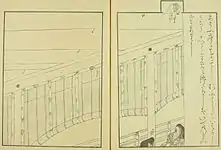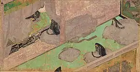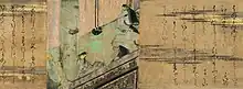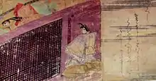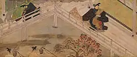 In the top right corner, Murasaki's friend, the maid Saishō no Kimi, is visible.[52] The large garden occupying the left half of the painting and the diagonally positioned building are considered to be a bold scene arrangement.[53] According to Penelope Mason, this is "one of the saddest and most beautiful [scenes] in the scroll", contrasting the beauty of the moonlit garden and pond on the left with the constraints of court life.[52] The latticed shitomi and the stewards separate Murasaki Shikibu from the outside world, keeping her a prisoner in the room.[51][52]