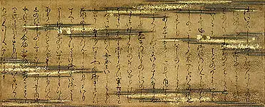 The 5th segment of the five-segment Matsudaira clan scroll was separated in 1932 and mounted as hanging scroll.[28] This fragment is 73.7 cm (29.0 in) wide.[63] Named after their present owners, it is known as the Morikawa clan edition. It consists of a single scene with a very short illustration showing the inside of a traditional Japanese style room with fusuma sliding doors, tatami and a curtain.[62] Like all but the first segment of this scroll, the scene is set in the evening of Kankō 5, 11th month, 1st day (December 1, 1008) on occasion of the 50th day celebration of the birth of Atsuhira-shinnō, the later Emperor Go-Ichijō.[62] Murasaki Shikibu and Saishō no Kimi had been hiding from the drunken carousal of that evening, but were discovered by Michinaga, Saishō no Chūjō and others. The painting is dominated by the massive figure of Fujiwara no Michinaga dressed in brocade jacket and trousers and placed in the centre of the room.[62] Murasaki Shikibu and Saishō no Kimi are huddled near the border of the painting with heads bent down as a sign of submission and deference.[51] On discovering the two court ladies in hiding, Michinaga demands a poem from each of them. Murasaki being frightened and helpless in this situation recites the following waka:[62][64]