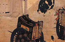 The cultural changes after the Heian period resulted in a more realistic depiction of figures including movements and gestures.[7] Abandoning the Heian period hikime kagibana ("slit eyes, hooked nose") style,[nb 4] figures were painted individual features and facial expressions that conveyed emotions and moods.[5][17][20] More generally, M. Murase notes that the expression of feelings subtly changed compared to the scrolls of the 12th century; here the rooms (or the inner space, because it depends on the fusuma) in the palace are larger and less intimate or private, and nobles come and go naturally and determined.[11] Unlike earlier scrolls such as the Genji Emaki, in which architecture and landscape were used as metaphors for people's emotions, interpersonal or societal pressures, in these scrolls the people's feelings are painted directly on the faces or shown through gestures, in addition to being expressed by the placement of characters within the scene. Architectural elements such as pillars, beams or platforms continued to be used to convey moods. Landscapes stand on their own as they are detached from the characters' emotions and gain a new function as a place to escape from the constraints of court life.[4][7][17]