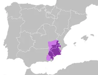Murcian (endonym: murciano) is a variant of Peninsular Spanish, spoken mainly in the autonomous community of Murcia and the adjacent comarcas of Vega Baja del Segura and Alto Vinalopó in the province of Alicante (Valencia), the corridor of Almansa in Albacete (Castile-La Mancha). In a greater extent, it may also include some areas that were part of the former Kingdom of Murcia, such as southeastern Albacete (now part of Castile La Mancha) and parts of Jaén and Almería (now part of Andalusia).
