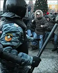 Around 15:00 the crowd started gathering at the Manezhnaya Square, including members of several nationalistic organizations, soon becoming over 5.5 thousand strong.[13] Sources indicate that as many as 50,000 people could have gathered.[14] As OMON forces tried to control the situation, some protesters tried to breach the cordon on their way to Biblioteka Imeni Lenina, resulting in fights between the parties. The angry crowd on the way attacked passers-by of non-Slavic ethnicity. As OMON forces started dispersing the crowd, hostilities escalated, and both sides sustained casualties. A total of some 65 people were arrested, and 29 hospitalized.[15][16] Three members of a nazbol (far-right) group, the Other Russia party (formerly linked to Putin through Dugin), were imprisoned for organizing the riot.[17] Human rights groups have expressed concern that this is a case of selective prosecution.[18][19]