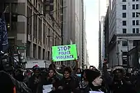 A 16-hour sit-in at the Cook County building on December 3, 2015, proceeded after Alvarez refused to resign on December 2.[105] Protests erupted in the Loop after Mayor Emanuel called a special council meeting to apologize for his slow reaction to fix problems within the Chicago police department.[58] On December 24, a month after the video had been published, protests disrupting Christmas-season shopping were again held on Michigan Avenue.[106] Protesters also stood in the alley behind Emanuel's home the last three days in a row in December, promising to continue for 13 more days—to symbolize the 16 shots McDonald took from police—in an effort to force Emanuel to resign.[107] On New Year's Eve, protesters temporarily took over parts of City Hall and a Hyatt hotel lobby, chanting "Rahm gotta go."[108]