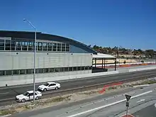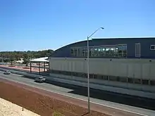 Northbound view of station building from the Kwinana Freeway in December 2007