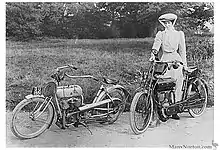 Hind later said she took up motorcycling because she "thought she would like to".[5] Her first motorcycle was a Singer, basically a motorised dropped frame bicycle, with a 2hp Motor Wheel added to the back wheel. The design was developed by Edwin Perks and Frank Birch of Coventry.[6]