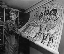 Muriel Nezhnie Helfman (February 28, 1934 – April 9, 2002), known professionally as Nezhnie, was an American artist, primarily weaving large tapestries throughout 1956–1992. She gained international attention in the late 1980s with a series of six tapestries, Images of the Holocaust, completed between 1979 and 1989. They were first exhibited as a series at the "Sazama-Brauer Gallery" in Chicago in 1988. Their imagery and texts are based on historical photographs of victims of Nazi persecution, such as ones by Mendel Grossman, and other materials that Nezhnie collected from the Library of Congress, National Archives, The Pentagon and the Yad Vashem Archives in Israel.