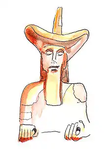 The major piece of the group is a seated terracotta statue with a wide brimmed hat, reminiscent of a cowboy hat, known as the Murlo Cowboy.[13] The statue is approximately 1.5 meters tall.[14] The bold facial expressions are representative of Archaic Greek Sculpture, as they eyes and lips appear to be protruding from the face. It is believed that the distinct facial features allow visitors to see them from afar, allowing for the statue to carry out its’ protective duties.[15] The statue probably represents a haruspex.