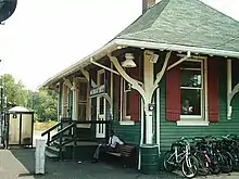 In addition to the building with ticket office and waiting room, this station stop has a bench shelter next to the main track. Permitted parking is available, along with bicycle racks along the station house wall.