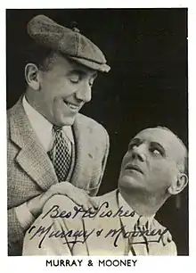 They established a format in which Mooney would interrupt Murray, the straight man, and start a joke with the words "I say, I say, I say...", an idiom which they are credited with popularising,[4] though it had been used previously by others.[5] After hearing the punchline, Murray would conclude by saying "I don't wish to know that - kindly leave the stage."[3] The format became well-known and stereotypical, and was often satirised by later performers. While some critics claimed that Murray and Mooney performed "awful jokes delivered at high speed", others have described them as a "classic double act.. [who were] guardians of a tight and restricted format", and in 1935 a critic in The Stage wrote that they "caused so much mirth as to interfere with their business".[6]