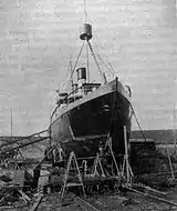 Murtaja was powered by a 1,600 ihp two-cylinder tandem compound steam engine driving a four-bladed propeller in the stern. Her four coal-powered boilers were located end-to-end as two pairs in a single boiler room in the midship.[2] The icebreaker could achieve a speed of 12.5 knots (23.2 km/h; 14.4 mph) in open water, although her seakeeping characteristics were extremely poor due to the specialized hull form.[32][33] In case of engine failure Murtaja was initially equipped with two staysails and two Bermuda sails, although they were rarely, if ever, used and disappeared from the inventory in the 1920s.[2]