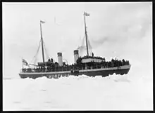 The sea trials on 23–26 March 1890 were witnessed by a group of experts, among them the Finnish-Swedish arctic explorer Adolf Erik Nordenskiöld, the first person to complete a voyage through the Northern Sea Route. During these trials Murtaja passed all but one of the tests for performance and general seaworthiness. Her draught at full load exceeded the contract specification by 1 foot 6 inches (0.46 m), meaning that either her specialized hull form could not be fully utilized in icebreaking or the coal capacity would have to be reduced, affecting her range and endurance.[14] However, the shipyard promised to do everything it could to reduce the draught of the vessel to an acceptable level and Murtaja, the largest and most powerful European icebreaker at that time, was delivered to the owner on 30 March 1890. She left the shipyard on the following day and headed to Helsinki, where she was welcomed by a large cheering crowd on 2 April 1890.[4][15]