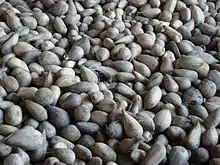 The Murumuru palm (Astrocaryum murumuru) is abundant in the Brazilian Amazon, extending to the borders of Bolivia and Peru. It prefers to grow in periodically flooded areas, especially on islands and in lowlands along the rivers throughout the Amazon River estuary and its tributaries, in dense or semi-open forests.[3] It is also frequently found in the lowlands of Marajo Island. The stem, leaves and fruit stalks are covered with hard, black spines that can reach over 20 cm in length, complicating fruit harvesting. When the fruit is ripe, the inflorescence (cluster of flowers) drops to the ground. The fruit contains a yellow flesh often consumed by rodents as food, which leave the seeds clean. The seed's hard shell is only separable from the kernel when dry. In general, 100 kg of dry seeds (12–15% water) yields 27 kg to 29 kg of kernels, which must be further dried to prevent deterioration during storage. These kernels then yield 40% to 42% oil. A single Murumuru palm produces about 11 kg of dry seeds. Hydraulic extraction can produce 35% oil relative to the dry weight of the kernel, which is equivalent to about 3.8 liters of oil per Murumuru palm. The kernels must be ground with grinding discs before hydraulic extraction. A kilogram of fruit pulp contains approximately 50 seeds. Seed germination is moderate and growth in the field is slow.[4][5]