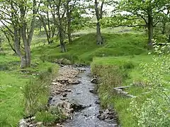 The Musbury Valley is a small valley in the Helmshore area of Rossendale Valley, Lancashire. Musbury Brook flows through its length, and its south side is flanked and dominated by Musbury Tor. In the 14th century it was part of the Earl of Lincoln's hunting park. Most of the Musbury valley is now sheep grazing pasture. To the south is Musbury Tor and Alden Valley; to the north-west is Musbury Heights and, beyond, the Grane Valley. Beginning as Long Grain Water on Musden Head Moor, the stream becomes Musbury Brook after its confluence with Short Grain Water.[1] It flows in a north-westerly direction to join the River Ogden, a tributary of the River Irwell.[2]