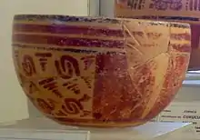 The vase was a drinking vessel for chocolate and depicts a mythological scene featuring what looks like the moon goddess,[15] but is more likely the tonsured maize god, who, functioning as a lunar deity, carries a rabbit in his arms.[16] The god is seated upon a throne, which is decorated with a celestial band.[15] Below him are three jars of pulque.[15] Only about half of the original scene has survived, and the text next to the maize god is illegible.[15] Only slight traces remain of a second person seated upon the same throne, to the left of the maize god.[15] Two rows of supernatural beings are seated on the floor before the throne, indicating that they are visiting the enthroned principal figures.[17] Three of these visitors can be identified, including two versions of God N, represented as separate individuals, and a being that is a man-bird hybrid.[17] These figures are also accompanied by hieroglyphs, although they are also illegible.[17] The vase includes a dedicatory hieroglyphic text around the rim that identifies it as the drinking vessel of a lord of the city of Naranjo.[17]
