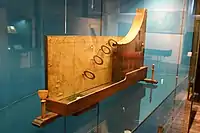 The room shows a reconstruction (1988) of the Theatrum Anatomicum (anatomical theatre) (built 1596). A richly decorated instrument chest (1670) which belonged to the Leiden surgeon's guild. A small collection of objects (largely Egyptian antiquities) that survived from the now gone Leiden Theatrum (one of the oldest museums of Europe ) are shown as well. On the wall three paintings: one depicting the magistrates of the Catharina and Caecilia Hospitals (the latter now houses the museum), a second showing a Prussian peasant from whom a 10-inch sword, swallowed in a drinking bout, has surgically been removed, a third showing renowned surgeon and designer of medical instruments Cornelis Solingen (1680). One of Solingen's inventions (part of the collection) was a screw to unindent a soldiers skull who had been hit by a bullet. Often in those days bullets did not fully penetrate a skull, merely deformed it.[12]