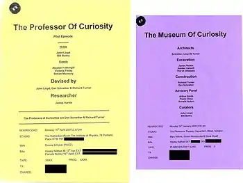 The programme's pilot episode was recorded on 16 April 2007 and was the entitled The Professor of Curiosity. The guests for this episode were Alastair Fothergill, Victoria Finlay and Simon Munnery. This pilot, recorded at the Rutherford Room at the institute of Physics, has not been broadcast.[12] The first series was recorded at the Pleasance Theatre in Islington and, since then, the show has been recorded at the BBC Radio Theatre, with occasional recordings at other venues, such as the Shaw Theatre and RADA Studios (formerly The Drill Hall), all in London.[12] The series was created by Lloyd, Richard Turner and Dan Schreiber. The show is produced by Anne Miller. The show's researchers are Mike Turner, Lydia Mizon and Emily Jupitus of QI.